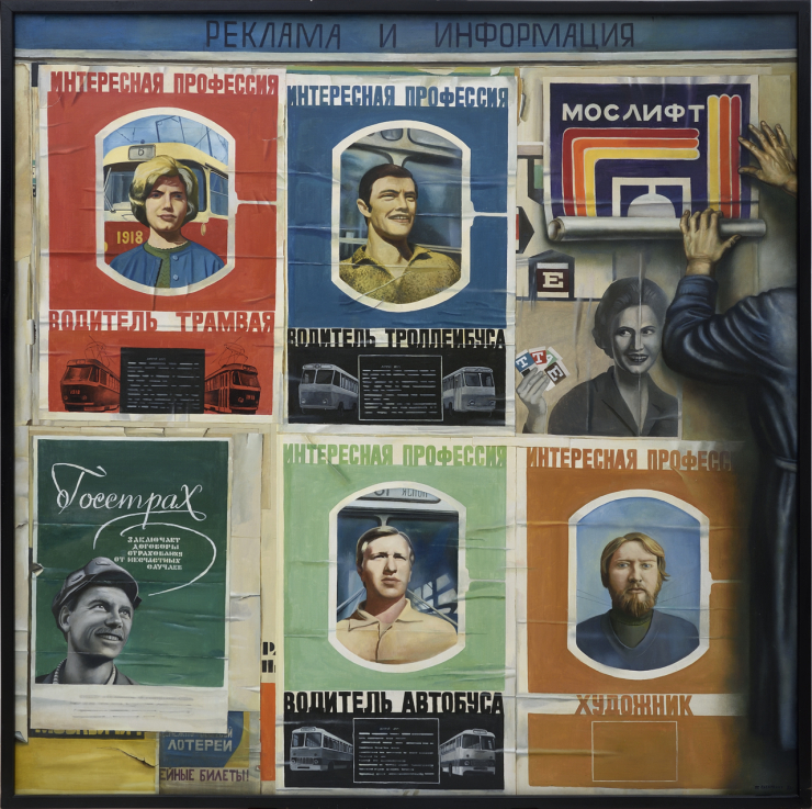Tatiana Nazarenko was a student of Dimitri Zhilinsky. In the seventies she was interested in topics taken from everyday life. Her paintings from this period represent Soviet daily life in grotesque, ironic style. Her main subject was solitude, which, according to her, is the most dramatic element of human existence. Despite the fact that her figures are typically depicted in groups, they all have an air of complete isolation and loneliness. Her painting Advertisement and Isolation contemplates “interesting” professions: it shows posters of a tram driver, a trolley bus driver, a bus driver and an artist. As a traditional medium of political propaganda, posters often used the iconic figure of the worker or the peasant for purposes of agitation. Nazarenko’s piece is a criticism of the consciousness-shaping mechanisms and clichés of both propaganda and advertisement. Also, she addresses her own position as artist by representing the artist as a profession. The “propagation” of the jobs of trolley bus and bus driver as advertisement and information is also ironic, as they appear in place of of the commodity to be advertised, alluding to the shortage economy of socialist countries. An interesting feature of the intentional retro-style is that it caricaturizes Socialist Realism, which had been eliminated by Khrushchev’s reform after 1953, but remained a fundamental cultural political model nevertheless. Parts of Nazarenko’s painting are rendered in photorealistic quality, as a reference to the tendencies of pop art and photorealism in Western art, still considered taboo at the time.