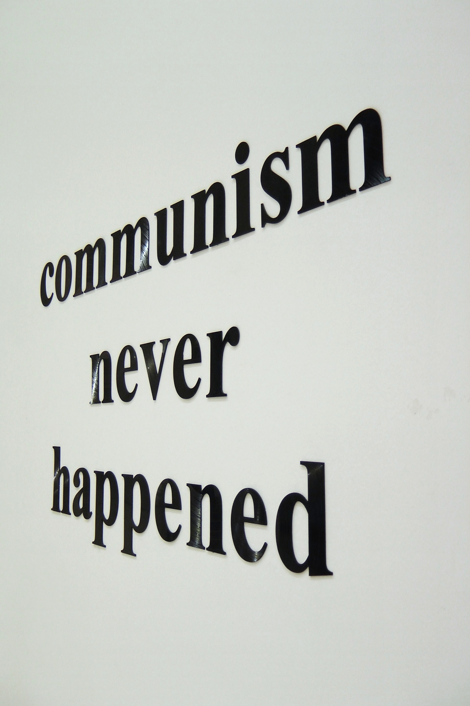 The critical activity of the Romanian artist living in Cluj Napoca is directed at describing the condition of post-communist Romania with the aid of sketch-like drawings, videos, transformable installations. As an editorial member of the neo-Marxist and post-structuralist journal IDEA, Mureşan is an active participant of a small, radical theoretical workshop, which has assumed a significant role in the consolidation of the critical intelligentsia and the critical assessment of the period of democratic transition. The raw material for his work Communism Never Happened is the voice recording of the big mass events of the Ceauşescu-period, the “Singing Romania” propaganda gala evenings. The letters cut out from black vinyl records form a statement that, beyond being provocative with the absurdity of denying a historical fact, demands the examination of the ideology. The Romanian totalitarian regime appropriated the codename of an – entirely different – social-economic system, of which there is no empirical experience to date, there cannot be, as it was never realized. Ciprian Mureşan’s work is directed not only at the deconstruction of the past, but also at the prospective realization of the ideologies projected into the future. (Emese Kürti)