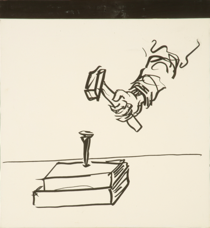 This painting was on display at the exhibition Ultramodern Nihilism in 1998 at the Ludwig Museum, as part of an installation of 30 paintings. The hammer as an object is overloaded with symbolic meanings, especially in case of an ex-Soviet artist. “People who can only handle a hammer see every problem as a nail” – the truism comes to mind at the sight of the painting. Especially as the two objects penetrated by the nail seem to be books, which are now united and made illegible, and thus destroyed, by the nail. At the same time, the hammer and the hand holding it are rendered in such beautifully fine, almost erotic lines that our negative assumptions waver. The arm resembles oriental calligraphies bearing deep philosophical con¬tents, rather than the limb of a barbarous savage creature. The spectator is thus baffled: perhaps this hand does belong to an artist, and it destroys books that deserve such fate. Edzgveradze gives no clear answer, just as his other works are more questions than statements. The goal is to make the spectators think and expand their world view.