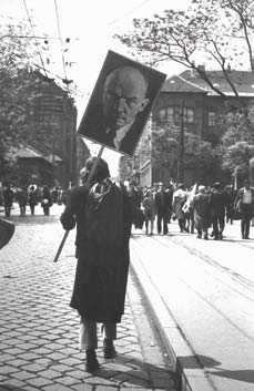 Born in Vojvodina in the former Yugoslavia, Szombathy started his career as a founding member of Bosch + Bosch, a group of progressive artists. Since the early seventies, he has been engaged in poetry, mail art, performance and graphic design. He has edited a number of art journals as well. On the 1st of May 1972, the usual labour day parade was held in Budapest: hundreds of thousands representing the working people marched down Dózsa György Road in front of the tribune with the waving figure of the leader János Kádár, to eventually get rid of their signs, banners and other accessories and take a break in the City Park with some beer and sausage. Bálint Szombathy’s action started after this: grabbing a procession sign with Lenin’s portrait, he continued rambling through the streets of Budapest, stopping in front of houses and fences, wandering into courtyards. Appropriating the sign depicting the leader of the Great October Socialist Revolution for the purposes of his own action, he practically removed Lenin from his original environment and placed him into a different context. The well-known symbol could suddenly be seen in different light: as the tool of a private artistic demonstration, it was confronted with the hopelessly grey and depressing “existing socialism”, which was the direct opposite of the colourful and falsely optimistic May 1st parade. K.Sz.