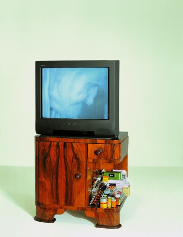 The artwork purchased by Ludwig Museum in 1999 consists of a real bed-table and a TV-set which shows a video. In the lower right corner of the table, on an open shelf is a dazzling quantity and array of medicines. The creation of the artwork started when Zbigniew Libera noticed the continual, monotonous noise coming from the neighboring apartment, produced by an old lady there who was constantly turning her chamber pot. Then through the door between the two apartments the artist discovered Regina G, the sick, blind, weak old woman who had to stay in bed all day, and whose only movement was the ritual-like turning of her chamber pot. The unconscious activity of the old woman (strongly sedated by medicines, and faint due to her illness) proved to be a religious ceremony: she substituted her rosary – which was taken away from her as a precaution – with this object. The chamber pot, besides its original function of containing of excrement, became invested by Regina G with the function of a mystical, reverential object.