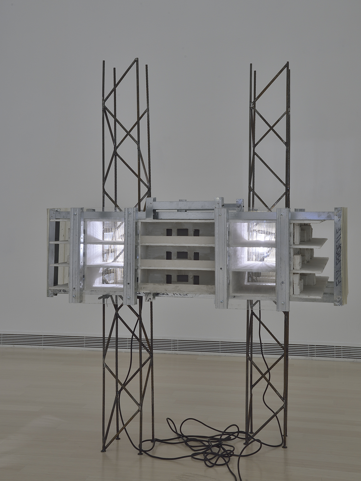 KASZÁS mainly creates objects, installations and murals in public spaces. The work is part of a series he made in 2015, in which he created mockups of real or fictitious buildings (for example, an iconic building of his hometown Dunaújvaros, one of the five blocks of flats on Május 1 ut, or a bare and abandoned skyscraper without walls and with small yurts hidden inside and rudimentary ladders for access). Among the mock-ups (or demonstrations) were a mining building (with a shaft lit by a miner’s lamp), but there were also strange hut constructions, housing monstrosities built from the open cabin of a Ferris wheel, and bungalow complexes made from recycled elements. The artist is fond of using ephemeral, very ordinary materials and waste, and his mock-ups and kiosk-huts are often based on the architecture of the Kassakian image. “This work reflects two ideas that, in retrospect from the present, defined modernist architecture. One is Adolf Loos’ essay Ornament and Sin, published in 1910, and the other is the idea of the Dom-Ino house, conceived in 1914 by Le Corbusier, who was greatly influenced by Loos. The Dom-Ino house is a reinforced concrete structure of a prefab, the essence of which is that its spaces can be arranged into rooms according to current needs. The installation consists of modern building materials such as rebar, drywall and prefabricated wall elements. The terraces on the shorter sides of the installation feature a series of plaster reliefs for decorative purposes. These imaginary murals are positives cast from the packaging of various products,” the artist explains the work.