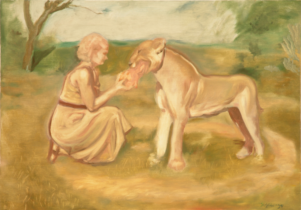 The painting entitled Outlandish was made for the artist’s first solo exhibition (1995, Studio Gallery), the theme of which was defined by the motif “woman with a lion”. The painting depicts a dream-like scene: in a savannah landscape, a female figure dressed in ancient Greek clothes (who strongly resembles the artist) feeds a lioness with raw meat. The scene is at once realistic and unrealistic, where a razor-thin line separates the harmony of peaceful coexistence from potential tragedy. In addition to the obvious biblical antecedents (1 Kings, Judgement of Solomon) – both figures are placed in a circle drawn around the two of them – the composition of the work is informed by cinematic and pop-cultural precedents. The situation is a direct quotation from Joy Adamson’s Born Free (Elsa and Her Cubs), without the chalk circle, of course. Glazing also reinforces the dream-like, memory quality of the scene, presenting the lion and the female character in even more unrealistic situations in the other paintings in the series. In the pieces of the series, different relationships and relations of power are narrated by the duo of woman and lion: images of embracing, loving, caring togetherness mixed with those of fear, passion, submission and equality. Possible and established female narratives and patterns of behaviour, desires, sometimes depicted in a romantic, sentimental, melancholic mood, or in liberating, often absurd, unimaginable situations. Through the mediation of desire-fulfilling fantasies, Szépfalvi uses representations of female positions to draw attention to patterns of stereotypical gender roles and social relations.