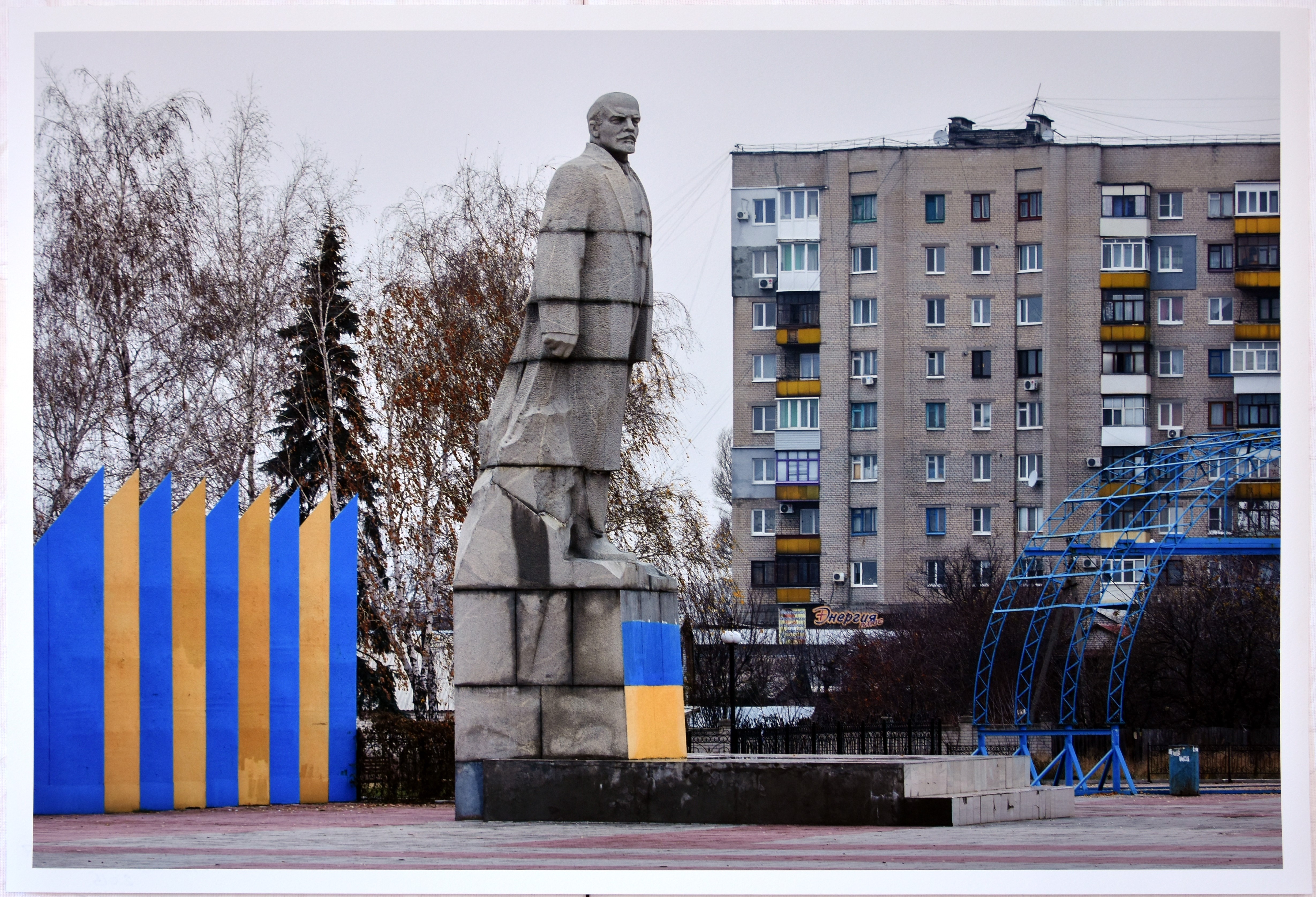 Like many other Soviet monuments in public space, the stone monument to Vladimir Lenin, located at the central square of Lysychansk, was partially painted in the yellow-blue colors of the national flag of Ukraine by unknown activists. The monument was dismantled soon after.