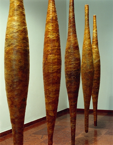 As a member of the experimental textile artists, Ilona Lovas entered the field of visual art with her large-scale installations. In her works, she employed unique, organic materials and craft techniques traditionally associated with femininity, where the materials, forms, and processes carried strong symbolism. They represented the artist's faith and search for meaning in abstract forms. In 1984, she began her series Stáció (Stations), in which the successive, interconnected works symbolized various stages of the human life journey and the quest for divinity. Station No. 26 consists of seven spindle-shaped objects, which the artist also referred to as “soul seeds” or “babies.” She wrapped the wire frames with washed intestines and swaddled them as if they contained a child or a soul. She elevated the "lowly" material to an ethereal quality, cleansing it of impurities and revealing its vital structure. Symbolically, she inverted what lies within us—emotions, desires, instincts, and things that are otherwise inexpressible. She often composed her works specifically for the space, giving a sacred character to the architectural environment.