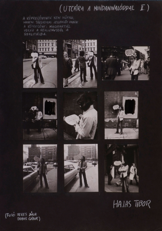 Tibor Hajas (1946, Budapest − 1980, Szeged) is an artist and performer. He broke off his university studies in English after his arrest following a street demonstration. When he was released on general amnesty, he studied bookbinding and worked in an industrial wood and paper cooperative. He considered himself primarily a poet, his art was self-taught, with an output beginning in the late 60s with a conceptual tilt. His To the Streets with your Message I−II is one of his first manifestations of this conceptualism: the visual documentation of poetry written on the side of a building, and the act of its writing as action art. In the spirit of other works of the day, A Letter to My Friend in Paris can be taken as the documentation of an art action. The series of pictures on exhibition shows the use of photographs, which became increasingly important in Hajas' work beginning in the early 70s. His work Living Comics initially seems to be part of cut-out cardboard speech bubbles applied to a photograph and carried on the street by the artist − but is in fact a physical component of this art action.