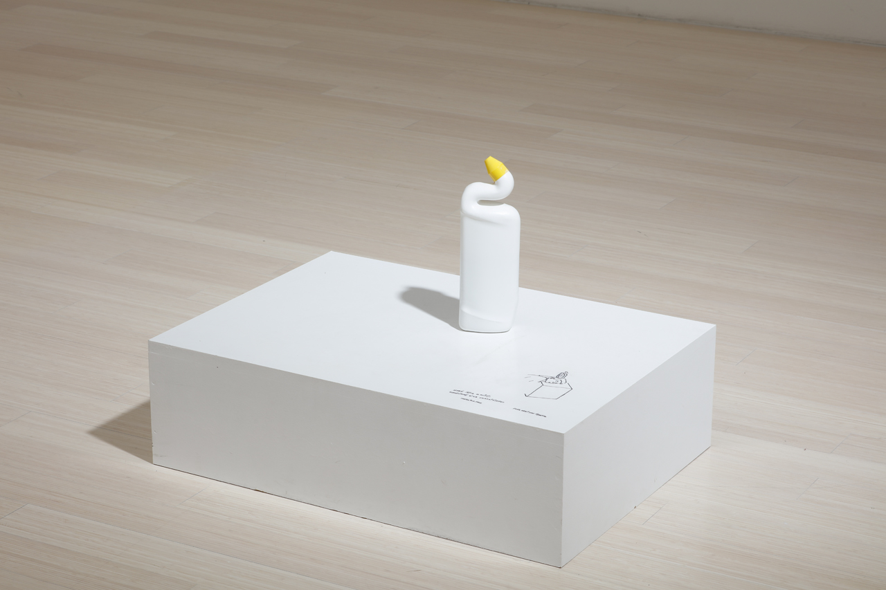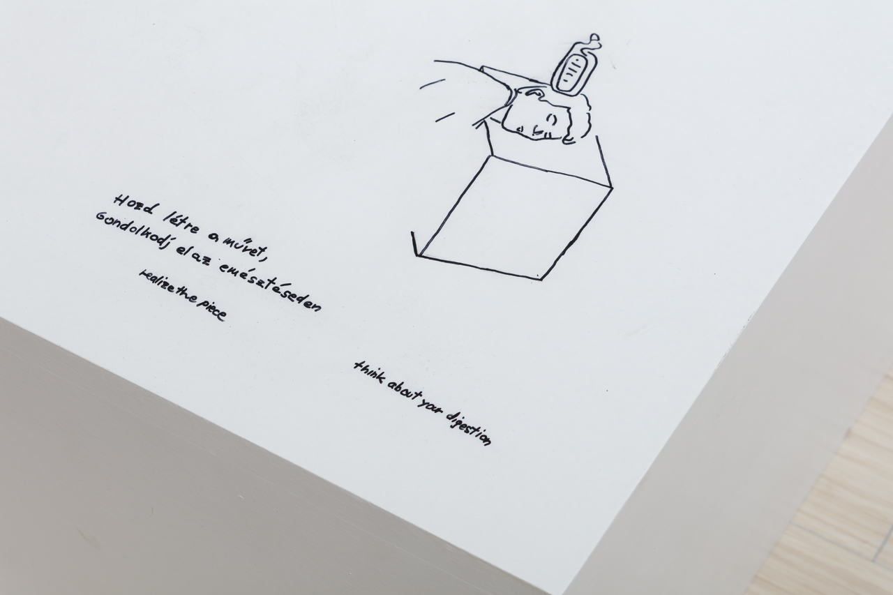 The extremely simple (or astonishingly banal) so-called “one-minute sculpture” invites the viewer to self-realization, while making Wurm’s thoughts on sculpture experiential and tangible: what makes something a sculpture, what determines the meaning and value of an artwork, what is the relationship between the physical appearance of a sculpture and its concept...? The artist expands the already broad boundaries of sculpture through his One Minute Sculptures, totalizing the possible forms of sculpture: “My videos, photos and books are all sculptures,” says the artist. He redefines the scope of the concept of sculpture, fundamentally questioning the expectations of the audience and attempting to reconfigure the temporal, social and interactive dimensions of sculpture. Most of Wurm’s One Minute Sculptures evoke funny situations, but are also challenging physical exercises. An important element of his work is the separation of authorship and realisation and then their reunion in the viewer: the visitor creates the work as an active participant and as a structural element of the living sculpture. In the pieces of One Minute Sculptures, the direct physical contact with the objects becomes an act of representation, and the sculpture is created as a requisite of a performative gesture, as a frozen situation.
