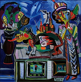 A gyűjteményben megtalálható naiv-népies szekció egyik tagja Rimas Zigmas Bičiūnas, aki intenzív színű tájképeket, csendéleteket és portrékat fest. Bičiūnas a vilniusi Képzőművészeti Akadémián tanult, témái többnyire allegorikus kompozíciók, vagy a pihenéssel, szabadidővel kapcsolatos jelenetek. Stílusa a naiv művészethez áll közel, műveinek tágabb formai és esztétikai párhuzama lehet Chagall festészete, az expresszionizmus és az Oroszországban nagy hagyománnyal rendelkező primitív festészet. Bičiūnas így nyilatkozott munkáiról: „Azt festem, amit érzek, amit képes vagyok érzékelni. Azt szeretném ábrázolni, ami hirtelen feltör bennem a hirtelen benyomások hatására, aztán többféle variációt készítek belőlük. Sűrűn visszatérek olyan témákhoz, amelyeket évekkel ezelőtt festettem. Sok időt szentelek litván emberek saját környezetükben, litván falvakban való ábrázolásának.” A Ludwig Múzeum gyűjteményében található, Csendélet népies szoborral című műve is az előbb említett jellegzetességeket hordozza. A szentképek stílusában ábrázolt alak, a népmesékből felbukkanó, a képekkel díszített ládán látható furcsa állat, a váza, ahogy a cím is sugallja, lehetnek a litván vidék karakterei és objektumai. Bičiūnas életművének nagyobb hányada abban az időszakban készült, amikor Litvánia a Szovjetunió része volt. Itt is végbement az erőszakos szovjetesítés, ami erős nemzeti ellenállást váltott ki, így a litván vidék megjelenítése egyfajta politikai ellenállásként értelmezhető.