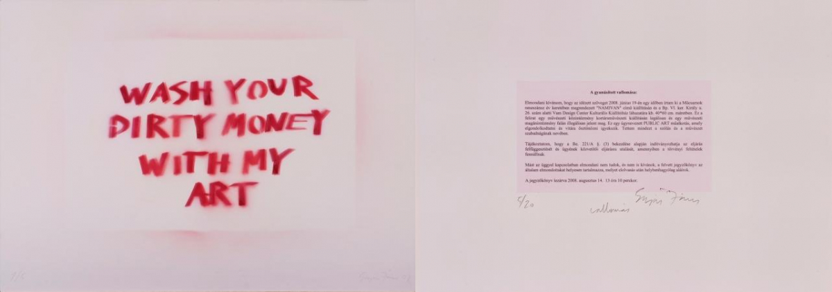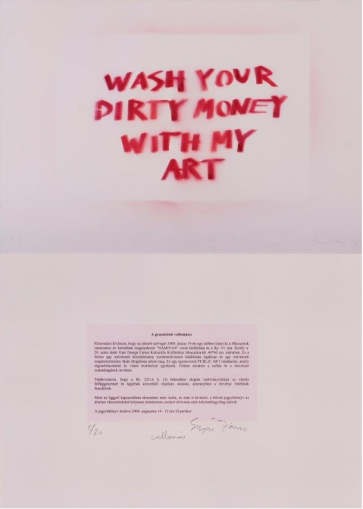 Sugár János nemzetközileg is ismert képzőművész, a művészeti akadémia tanára 2008-ban festékszóróval és sablonnal az alábbi szöveget fújta egy budapesti, belvárosi, magánkézben lévő kiállítóterem falára: „Wash your dirty money with my art” („mosd a piszkos pénzedet a művészetemmel”). A tulajdonos feljelentést tett, a művészt az ellene indított büntetőeljárásban 5 hónap felfüggesztett börtönre ítélték. Az ítélet meglehetősen eltúlzottnak tűnik, ha a graffiti méretét, szofisztikált megjelenését és a helyreállítás költségeit vesszük. A művész akciója valószínűleg a benne foglalt kritika miatt váltotta ki a tulajdonos dühét, aki többek között bombasztikus kiállítások bemutatására és pályakezdő művészek menedzselésére szakosodott. Az azóta csődbe ment és bezárt intézmény a fiatal művészeket árunak tekintette, akiket megfelelő marketing-módszerekkel és némi befektetett pénzzel néhány év alatt piacképessé tehet. Sugár az üzletember hitelességét és hozzáértését kérdőjelezte meg köztéri akciójával, aki viszont az akciót provokációnak és „nem-művészet”-nek nyilvánította. „Amikor a Műcsarnokban kiállították a munkát, úgy éreztem, éppen a lényege veszik el, ha megmarad ebben a biztonságos, elitista környezetben. Attól válik relevánssá, ha az utcára kerül. … Az érdekelt, hogyan lehet láthatóvá tenni egy nem nyilvánvaló álláspontot ", nyilatkozta a művész. Sz.K.
