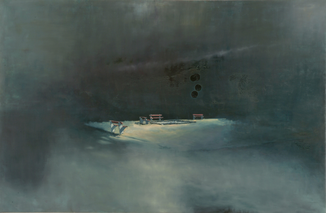 Szűcs Attila festményei gyakran készülnek fotók alapján, ám stílusa távol áll a fotórealisztikus hűségtől. A homályba vesző, életlen részletek, az átfestett, rejtett motívumok, a szín- és fényeffektusok titokzatos, helyenként nosztalgikus, máshol kísérteties hangulatot kölcsönöznek képeinek. A Játszótér éjjel című festmény közepén a hatvanas-hetvenes évek tipikus játszótere sejlik fel: homokozó, körülötte néhány jellegzetes pad – öntött betonlábakon pirosra festett fadeszka. A társadalmi utópiák beteljesítésére épült lakótelepeken új generációk nevelkedtek, a panelgyerekek délutánonként együtt lógtak a házak közti játszótereken. A lakótelepek egykori telepesei mára megöregedtek, a gyerekek felnőttek, a házak felújításra várnak. A szinte elpusztíthatatlan bútorokat csak a játszóterek EU szabványosítása, 2004 után kezdték lecserélni, a vascsőből készült mászókákkal, csúszdákkal és rakétákkal együtt. Szűcs Attila az egykori szocialista játszótér kollektív emlékezetét különös hangulatú, álomszerű éjszakai jelenetté fordítja át. A kép nagy részét a hatalmas, sötét felület tölti be, közepén a szinte lebegni látszó, színpadszerű, üres játszótérrel. Sz.K.