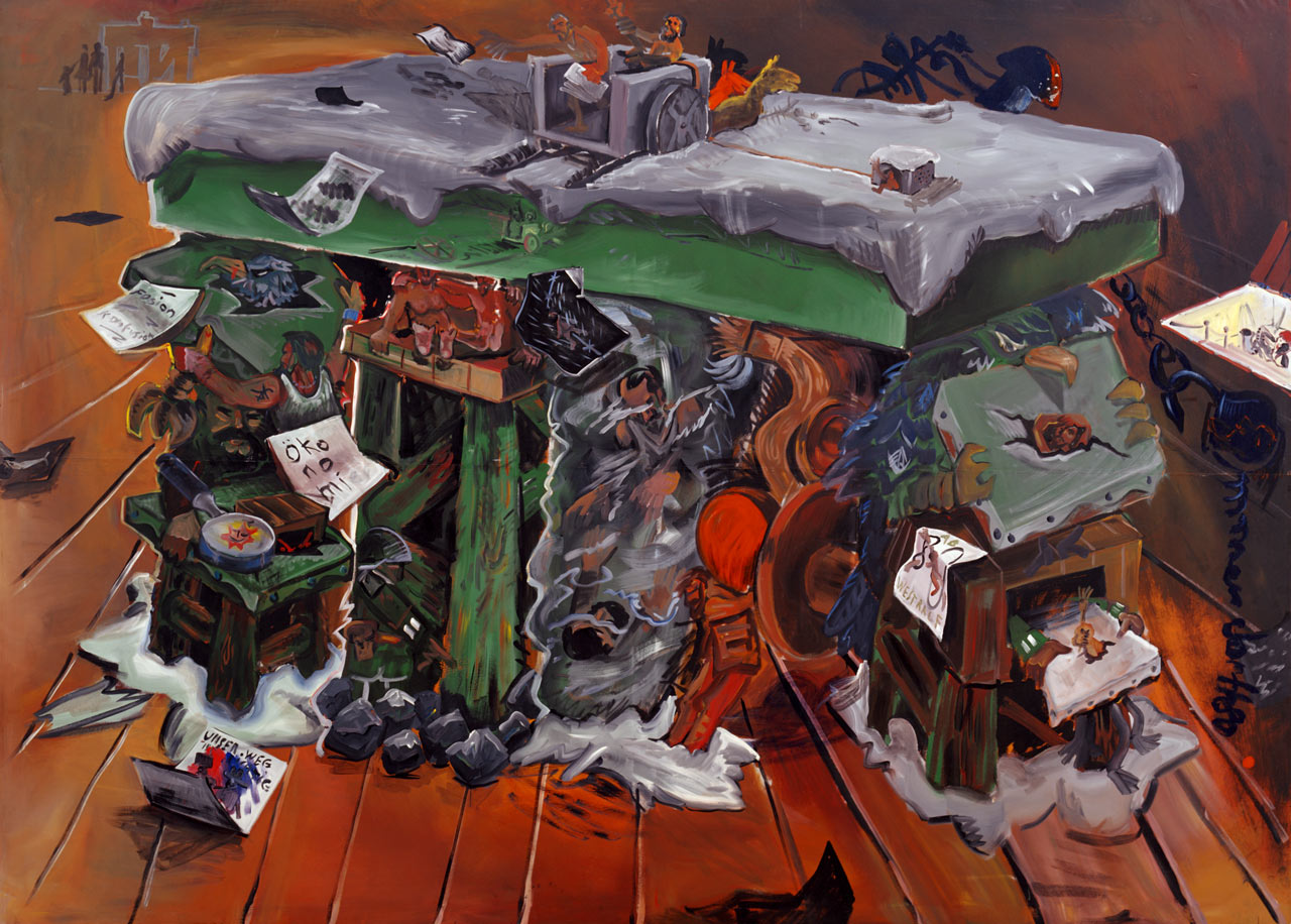 Jörg Immendorff (1945–2007) festőművész a háború utáni német művészet fenegyereke, a Neue Wilde (Új vadak) festészeti mozgalom tagja, Joseph Beuys tanítványa; akinek számos botrány kísérte pályafutását. Újbaloldali radikális gondolkodóként és művészként indult, majd a hetvenes években elutasítva a modern európai politikai ideológiákat a maoizmus mellett kötött ki. Munkásságát több nagy, évekig tartó festészeti ciklus jellemzi; legismertebb sorozata a Café Deutschland (1977–1984), amely 16 nagyméretű festményből áll. Képein Immendorf zsúfolt, színes képi világot teremtve fejti ki saját narratíváját Kelet és Nyugat szembenállásáról, a németség történelmi sorfordulóiról, ideológiákról, politikusokról… A Kapu című munkája is ebbe a sorozatba tartozik, amelynek első vázlatait még 1977-ben hozta létre. A későbbiek során többféle médiumban, eltérő műfajokban is elkészítette a mű változatait, amelyek sorába tartozik a budapesti munka is. A kapu-képek konokul visszatérő alapmotívuma a berlini Brandenburgi kapu, a német államiság szimbolikus emlékműve: a vázlatosan ábrázolt építmény felső lemezét egy hófedte tábla alkotja (utalásként a hidegháború fagyos légkörére), pillérein és párkányzatán heraldikai motívumok, politikusi portrék jelennek meg. Immendorf szatírával vegyítve, önkritikusan szemlélte saját magát és hivatását is, a festményen a gazdaságra és a művészetre utaló elemek mellett a társadalmi igazságosságért folytatott reménytelen küzdelem képeit fedezhetjük fel. Munkájának plasztikai változata (Brandenburger Tor, Aachen) monumentális installációként térben jeleníti meg a művészt foglalkoztató nagy világkérdéseket. A Kapu egyszerre foglalja magában a globális politikai történések, a történelmi emlékezet és a személyes identitás jelentésszintjeit.