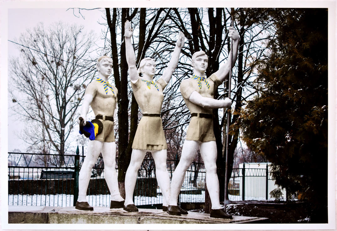 A szovjet úttörők tipikus szoborcsoportját az egykori Úttörőpalota mellett az ukrán nemzeti zászló színeire és a PLASZT ‒ a hazafias fiatalság szervezet ‒ egyenruhájának színére festették.