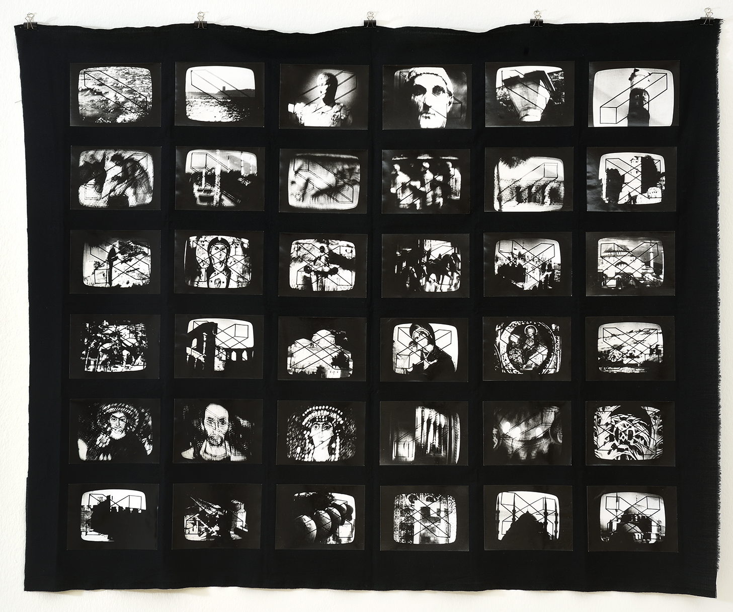 HALÁSZ KÁROLY a hetvenes évek óta meghatározó alakja a magyar kortárs művészetnek. Az 1972-ben készült mű a magyar televízióban vetített, Bizánc című művészettörténeti dokumentumfilmen, illetve két téglalap találkozási lehetőségein alapul. Tulajdonképpen egy fotóakció: a művész celofánlapokra rajzolta a téglalapokat, amit a tévé képernyőjére ragasztott, és hárompercenként készített képet a random kompozícióról. A mozdulatlan, geometrikus ábrát ütközteti az időbeliséggel, a véletlennel és a film ábrázoló, történeti tartalmával, ugyanakkor az axonometrikus rajzzal térbeliséget ad a képernyőre vetített képeknek. A fotóakció végeredménye maga a mű; Halász a 36 lenyomatot ragasztóval egy vászonra vitte fel.