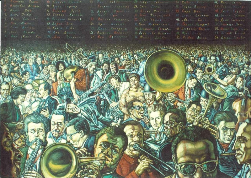 Mihail Romagyin nemcsak festőként, de könyvillusztrátorként és díszlettervezőként is ismert. Művészcsaládba született, nagyapja és apja is festő volt. A Szovjet Állami Geraszimov Filmakadémián végzett. Számos színházi munkája mellett A. Koncsalovszkij és A. Tarkovszkij filmjeiben működött közre (Solaris, Andrej Rubljov, Tükör). Igen termékeny alkotó volt, aki fáradhatatlanul rajzolt, festett szinte mindig és mindenhol. Gyerekkönyvekhez készített rajzain generációk nőttek fel. Stílusa leginkább a német expresszionistákéhoz köthető. Erőteljes színek és vonalvezetés jellemzi. Kompozíciói általában sokalakosak, szinte zsúfoltak. Ábrázolásai mindig narratívak, illusztrációszerűek. A nagy jam session szovjet és amerikai zenészeket ábrázol. A régi, tudományos-magyarázó ábrázolásokat követve az egyes alakok mellett számok találhatók, a kép felső harmadában pedig a számok mellett a zenészek neve olvasható. Szerepelnek a képen a legismertebb amerikai jazz-zenészek Bing Crosbytól Duke Ellingtonon és Doris Day-en át Theolonius Monkig, de találunk a képen oroszokat is, mint a zongorista Vagif Szadikovot vagy a zeneszakértő Alekszej Batasovot. A kép szereplői valószínűleg a festő személyes kedvencei, akiket a jazz műfaj legnagyobbjainak tart, és akiket szívesen hallana együtt, egy nagy jam session keretében játszani, ám ez nyilvánvalóan sem térben, sem időben nem valósulhat meg.