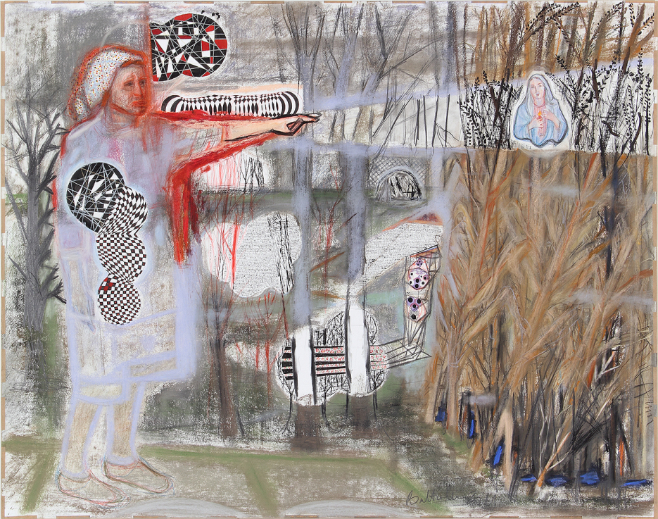 Bukta Imre a kortárs magyar képzőművészet egyik legeredetibb alkotója. Sajátos, úgynevezett „mezőgazdasági művészete” a posztszocialista magyar vidék sajátosságait, problémáit, jellegzetes figuráit ábrázolja, nagy empátiával, sokszor iróniával, ám mindenféle nosztalgia és idealizálás nélkül. A kelet-európai modernizáció, az erőszakos kollektivizálás után újra feldarabolt és reprivatizált – napjainkban a hatalmi elit által újrafelosztott – termőföldhöz Magyarország legtöbb régiójában elnéptelenedő, elöregedő falvak, reménytelen sorsok kötődnek. Az ország észak-keleti régiójában, Mezőszemerén élő művész közvetlen ismerőseit ábrázolja képein: a templomba és bevásárlóközpontokba járó öregasszonyokat, a munka nélkül maradt ingázókat, a nehéz sorsú cigányokat, a kocsmák népét, a szürke zónában alig láthatóan létező „másik Magyarországot”. Sajátos montázstechnikával készült festményein és grafikáin a remény nemegyszer Mária és Krisztus képében, látomásként jelenik meg, ahogy ezen a képen is, ahol az otthonkás, fejkendős szomszédasszony mintegy felmutatja, kivetíti a szívet tartó Szűz Máriának (Magyarország védőszentjének) képét a tájba. A pasztellkép lágy szín- és formavilágát éles körvonalú, modernista, geometrikus alakzatok törik meg, melyek további formai- és jelentésrétegekkel gazdagítják a képet. Sz.K.